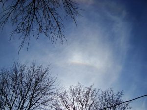 正當我抬頭看那砍斷樹枝的位置,並雀躍地感謝神時,在幾乎仰角90度的方向,無雨也無霧的晴朗天空裡,出現了一道短短的彩虹。在兩朵雲中間的那道彩虹,像極了孩子畫冊中所畫的那般可愛。我知道神再次告訴我,祂與我有個彩虹的約定:祂使我的心靈不再漂泊,祂以火熱的心永遠愛我。